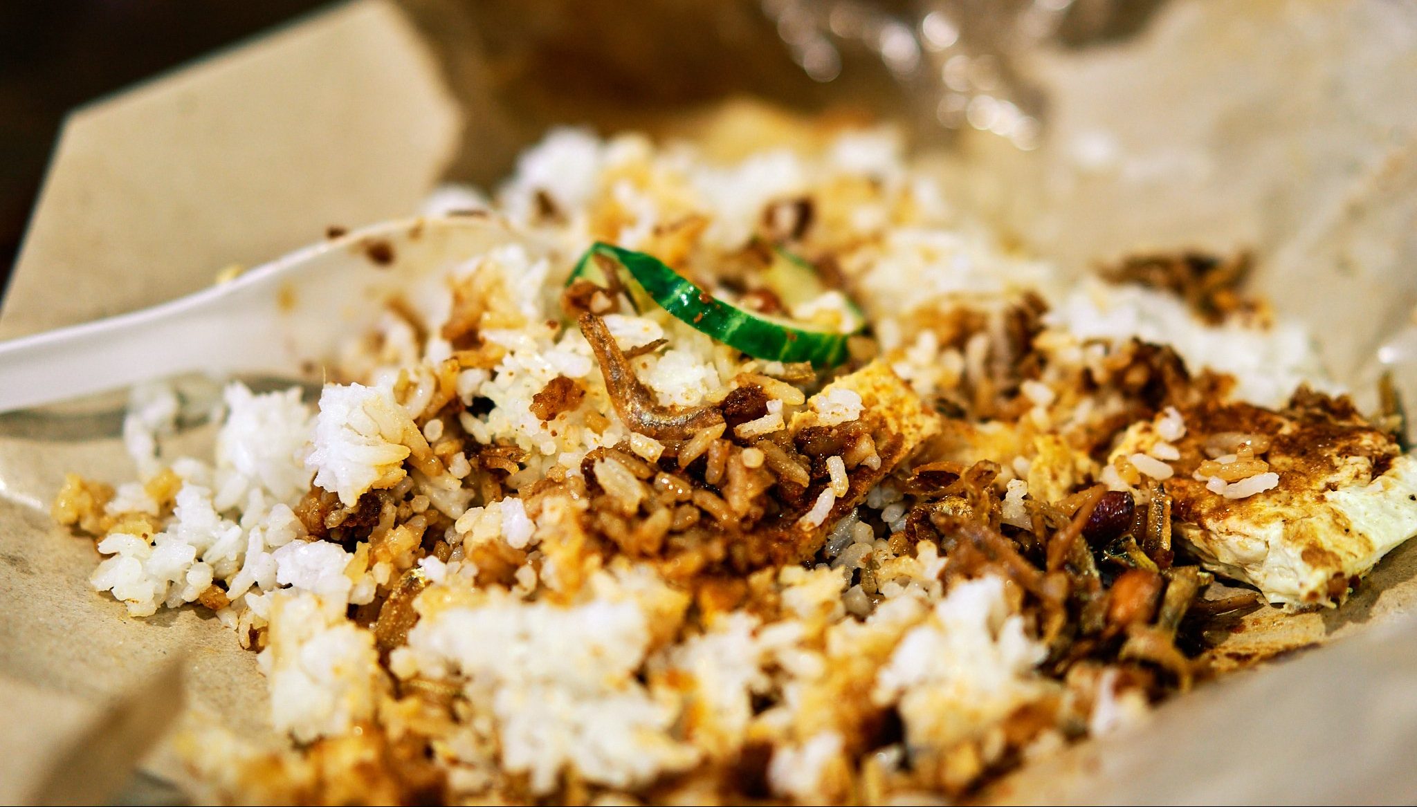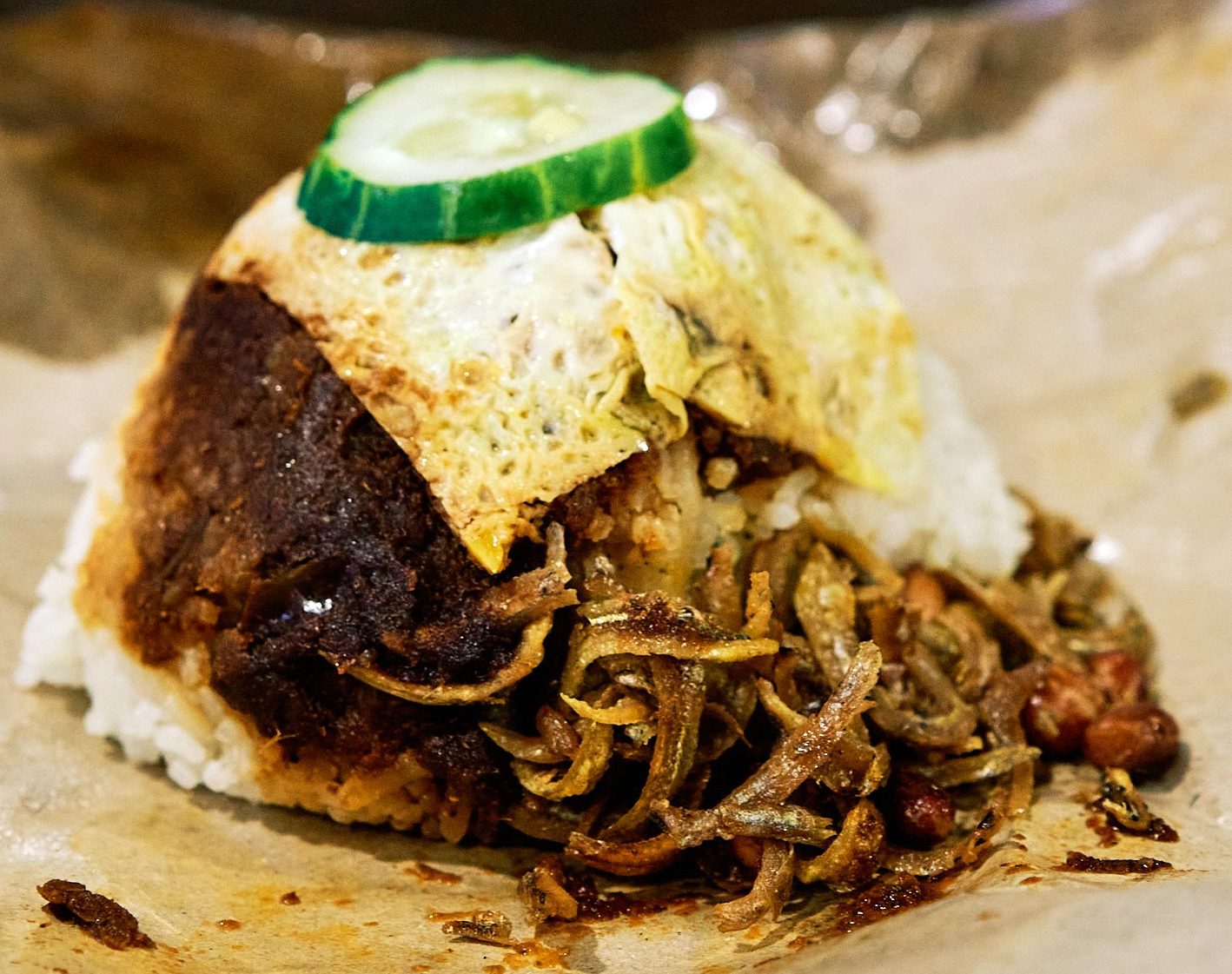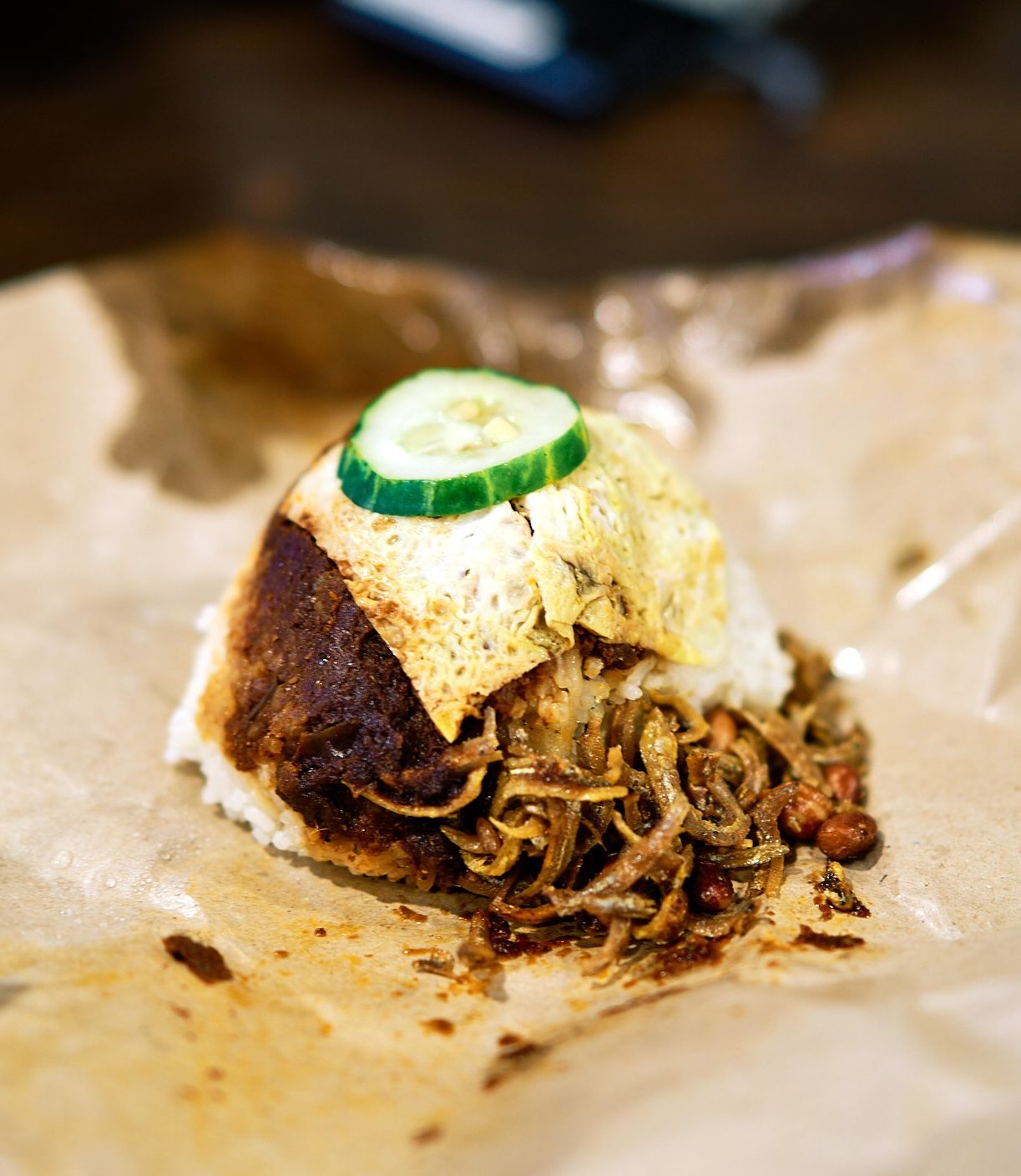 When you order the nasi lemak to go, it is packed right in front of you. A piece of brown packing paper is pulled out in a swift orderly fashion, placed on top of the table. A serving of rice is then cupped onto the packing paper, followed by a generous slather of belacan plopped on top of it. Then with a quick flurry of movements, the other ingredients, ikan bilis and/or fish, a piece of egg, and a slice of cucumber are all thrown onto the mix.